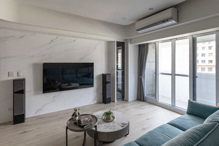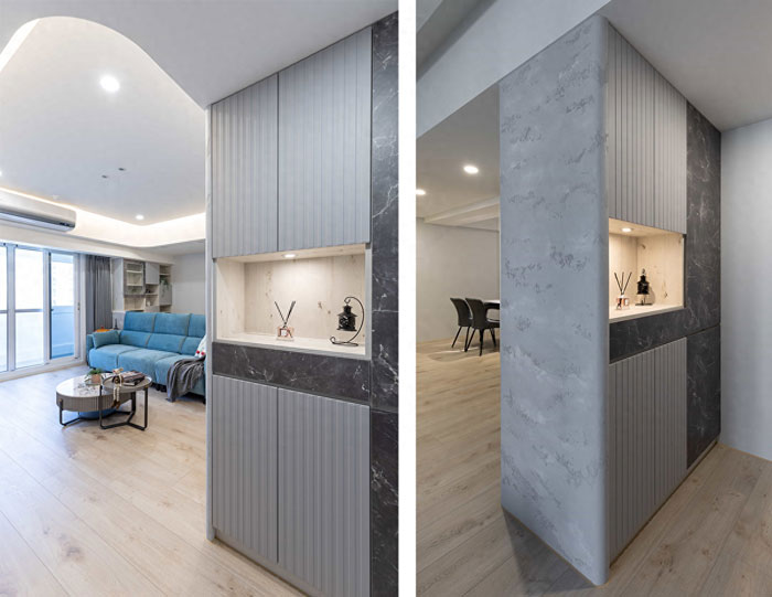 床尾设计了L型储物柜,提高收纳的同时也保留了采光窗,以细致的手法创造舒适氛围感。柜体局部做了陈列设计,避免单调。