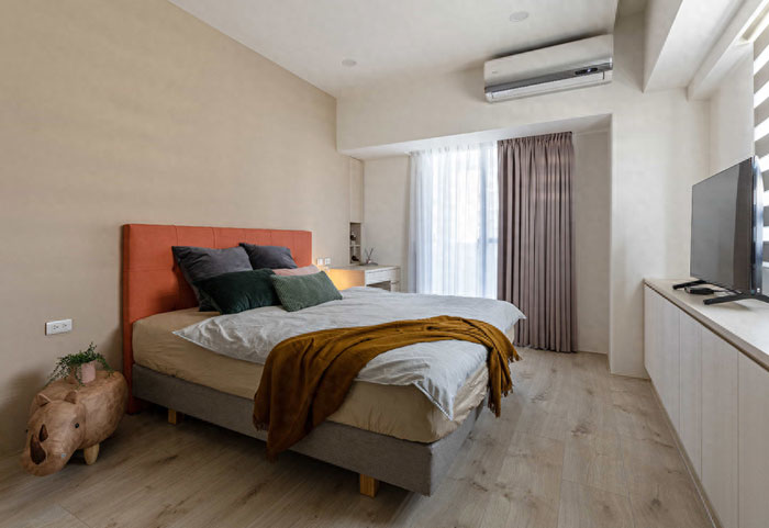 改造后的卧室,重新调整了色彩配置,木质色调成为主要用色,背景墙暖橘色点缀,让整个空间散发柔润气息。整体采用无主灯设计,给予了更简洁的视觉呈现。